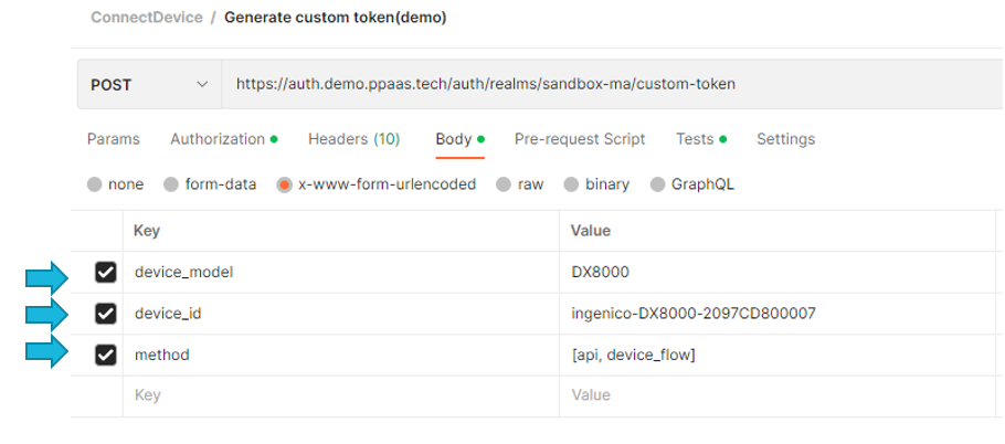 POST https://auth.demo.ppaas.tech/auth/realms/sandbox-ma/custom-tokenyou need to provide the url encoded.